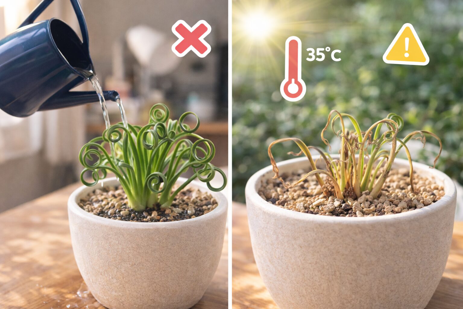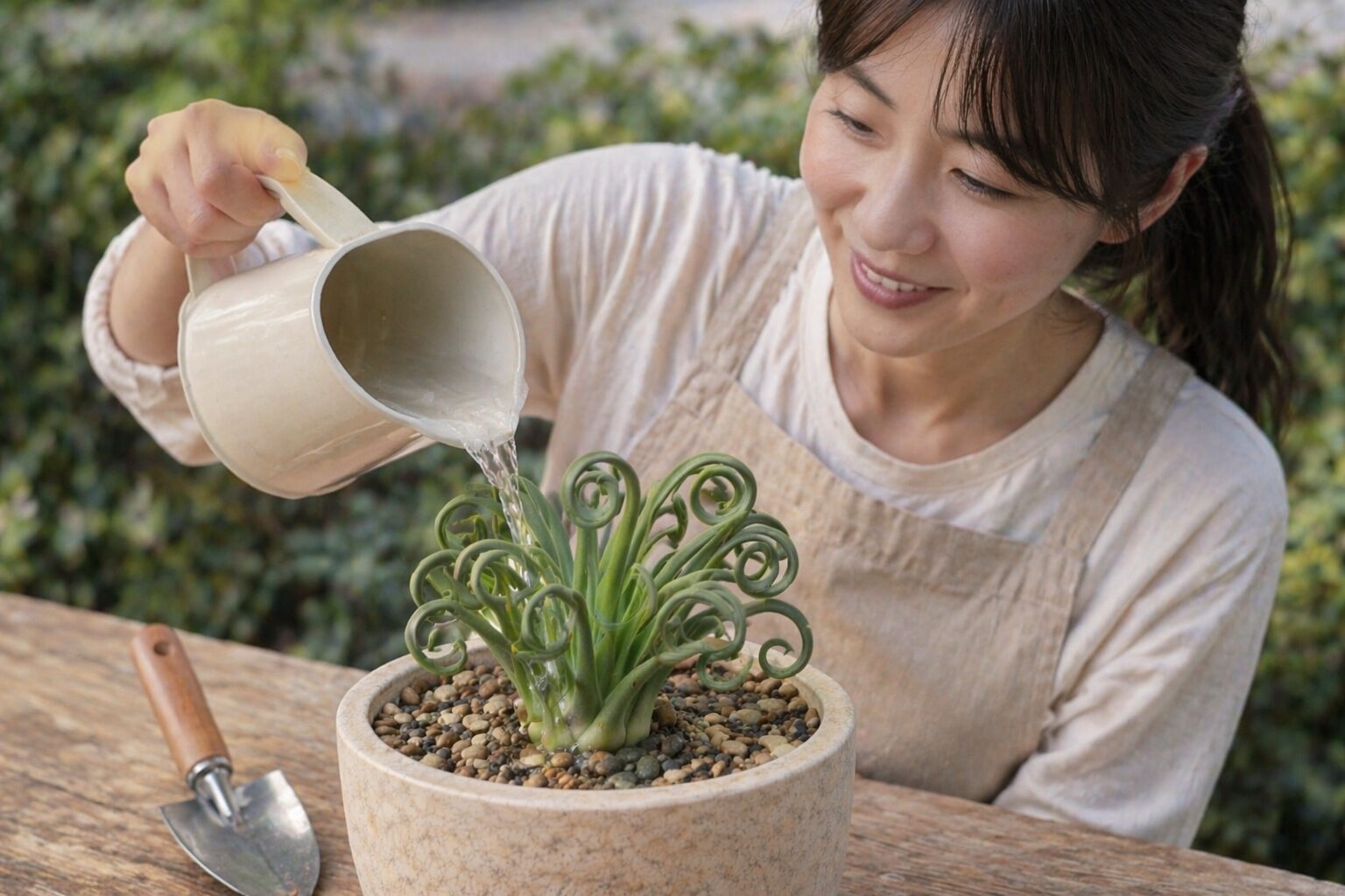 水やりも、アルブカの見た目を大きく左右します。よくあるのは水やり過多です。土が乾く前に何度も与えていると、葉がやわらかく伸びてしまい、くるくるになりにくくなります。球根植物は水を蓄える力があるので、いつも湿った環境では本来の締まった姿が出にくいんですよ。ここは感覚で管理しすぎるとズレやすいところで、表面が少し乾いたからすぐ水をあげる、受け皿に水が残っていても気にしない、といった状態が続くと、球根のコンディションが少しずつ落ちていきます。