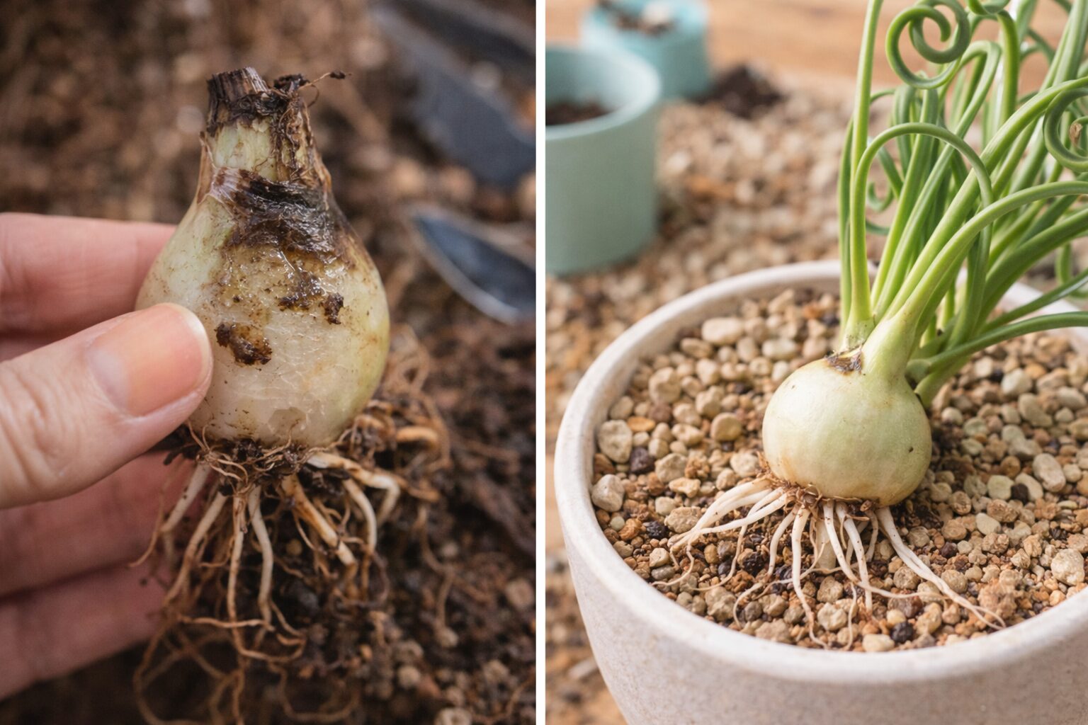 私が植え替え時にチェックするのは、球根の硬さ、根の量、根色、古い外皮の状態、用土の詰まり具合です。根が極端に少ない、茶色く傷んだ根が多い、土が粉っぽく締まりすぎている、鉢の中で根がぎゅうぎゅうになっているといった場合は、葉に不調が出やすいです。逆に、球根がしっかり硬く、白い健康な根がある株は、新葉の立ち上がりも安定しやすいです。