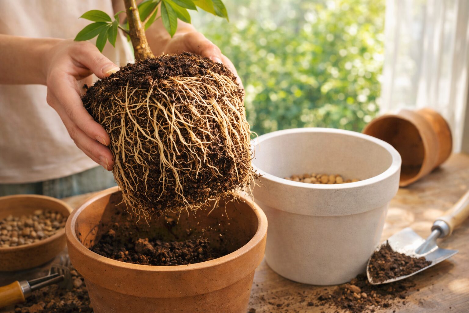 植え替えでテンションが上がって、根をガッツリほぐして切りまくると、回復に時間がかかることがあります。私のやり方は、外周の根を軽くほぐす、黒ずんだ根や傷んだ根を中心に整理する、くらい。根を触るほど、植物はストレスを受けます。幹を太くしたいなら、植え替えで弱らせないことが大事です。