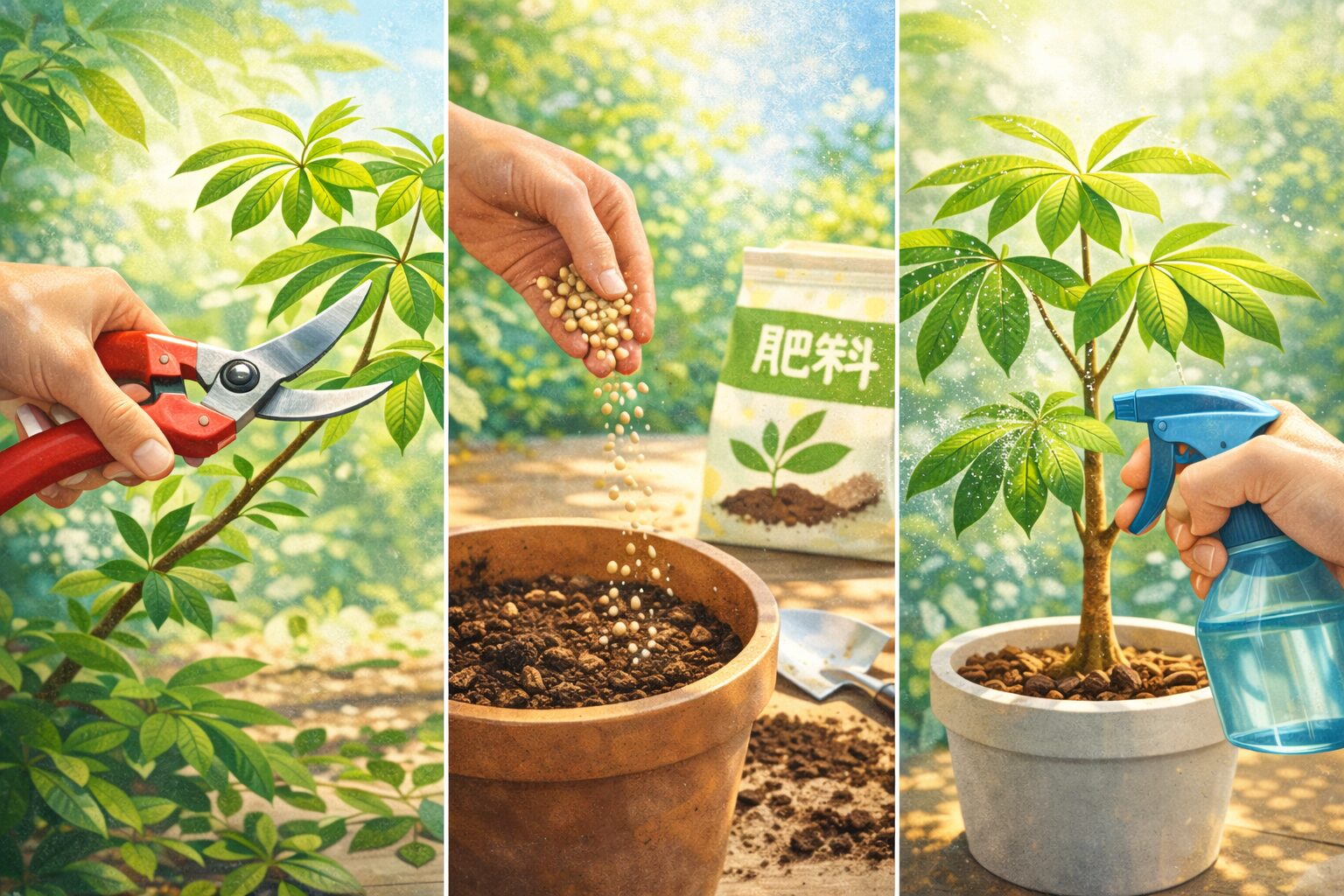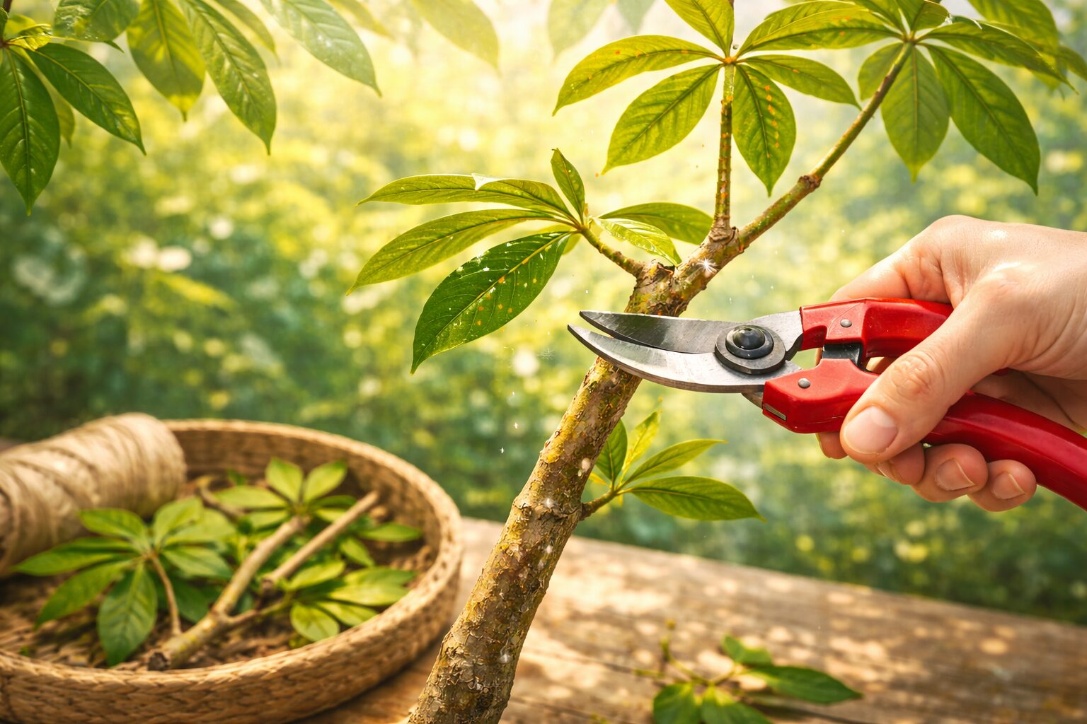 ここからは、幹を太くする“伸ばし方”の話です。ポイントは、光と根の土台を整えた上で、剪定・肥料・湿度管理で幹にエネルギーを集めること。順番を守ると、見た目も健康も両方良くなります。