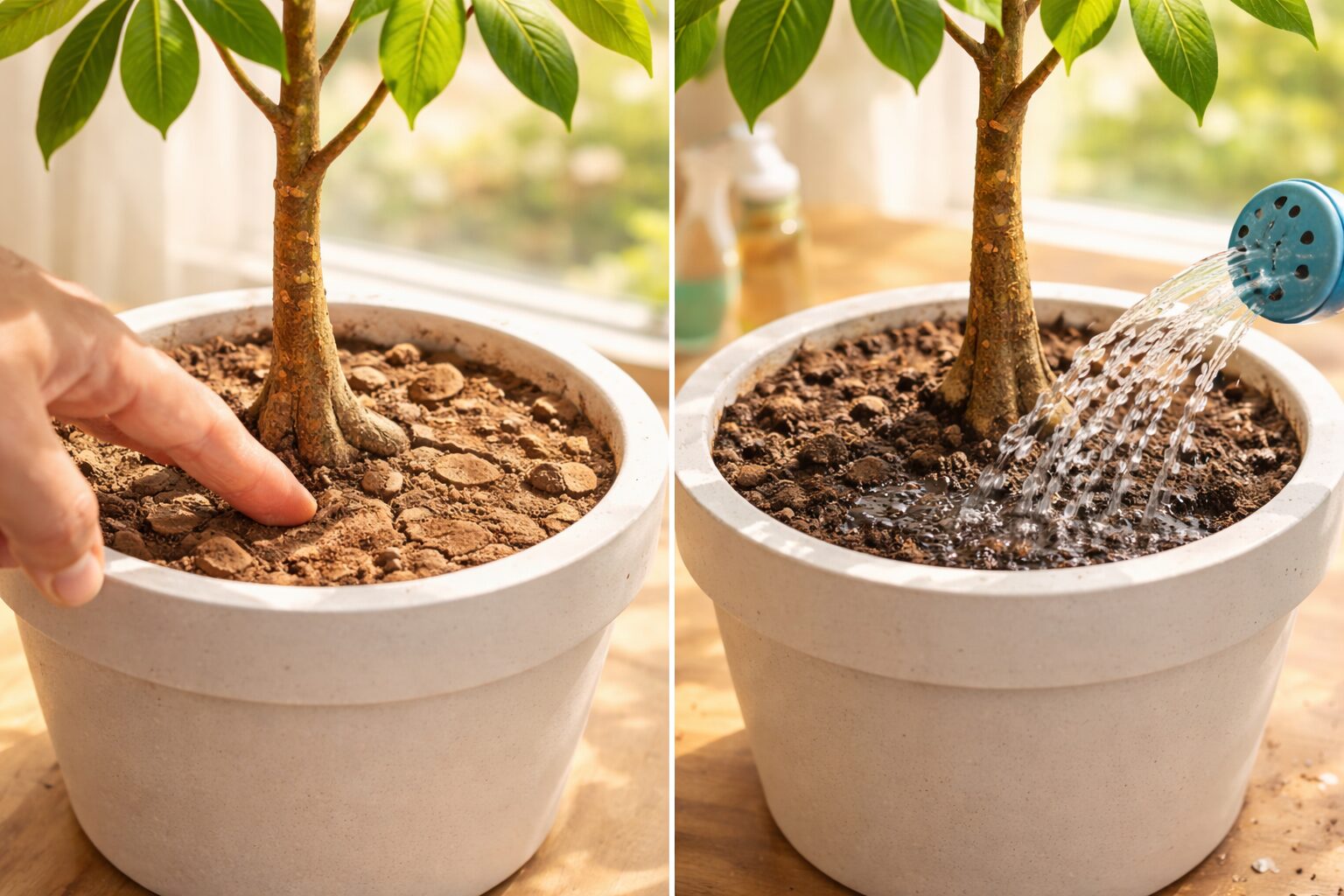 幹を太くするには「根が元気」が大前提です。そして根を元気にするいちばんの近道が、水やりの乾湿メリハリです。ここを外すと、光を増やしても剪定しても、なかなか太りません。逆に言うと、水やりが整うと一気に安定します。あなたも「水やりが正解か不安…」ってなりやすいと思うので、ここは丁寧にいきます。