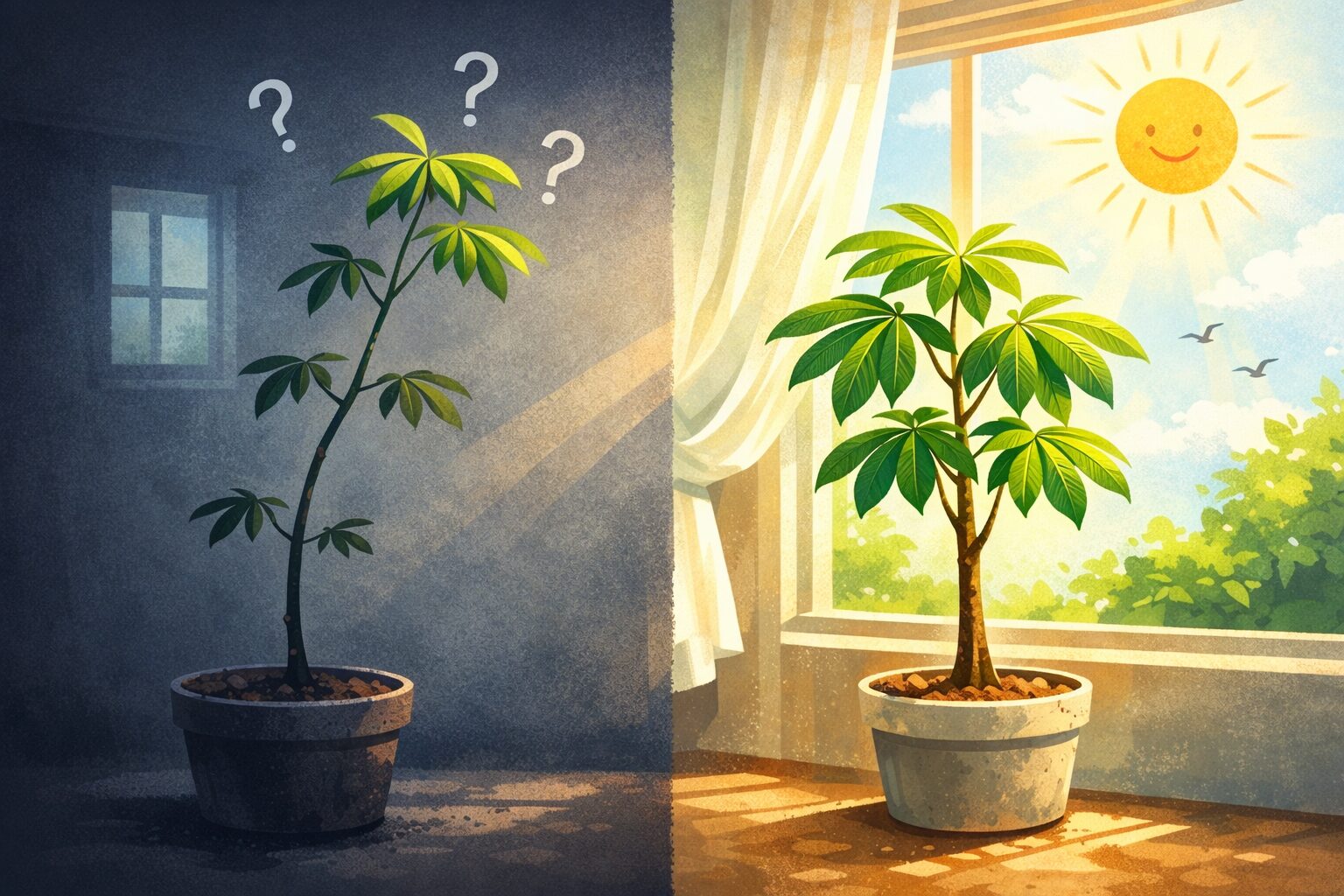 幹が細いとき、いちばん多いのが光不足による徒長です。光が足りないと、エバーフレッシュは「光を探して伸びる」方向にエネルギーを使います。結果として節間が伸び、葉と葉の間がスカスカになり、見た目が間延びしてしまうんですよね。ここ、気になりますよね。